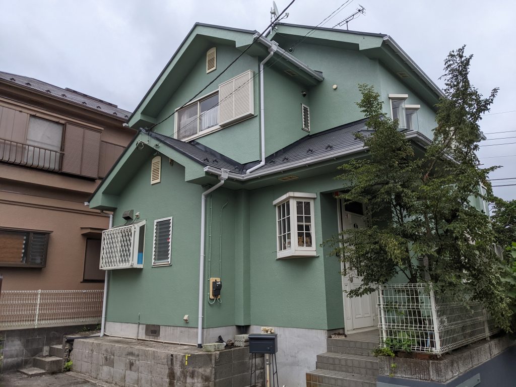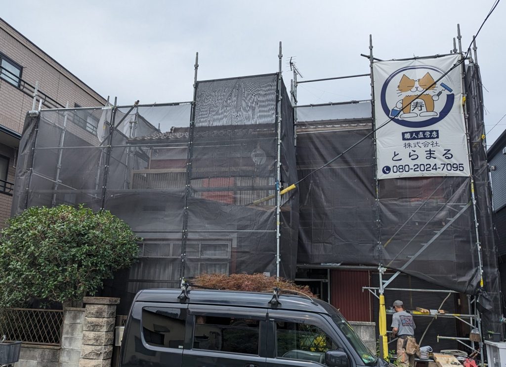 外壁塗装や屋根塗装の場合、初日に足場を組み、足場全体にメッシュシートを掛けます。